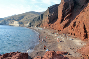 The caldera cruise gives you a glimpse of the beaches on mainland Santorini that you'd probably want to visit next. I'd recommend Ammoudi Bay, probably Santorini's best swimming spot (although not a beach) — walk down from Oia to Ammoudi Port, turn left and walk along the water's edge for a few minutes, then jump from the rocks into the aquamarine waters below — but that's risky, so I'd rather suggest Red Beach instead. On the approach the beach and its backdrop are breathtaking. On the shore the pebbly sand is mostly red. (The color of beach sand on the island depends on the geological layer exposed over time; beaches with pebbles and sand from red solidified lava include the Red Beach.) Here the water is noticeably warmer because lava absorbs heat.